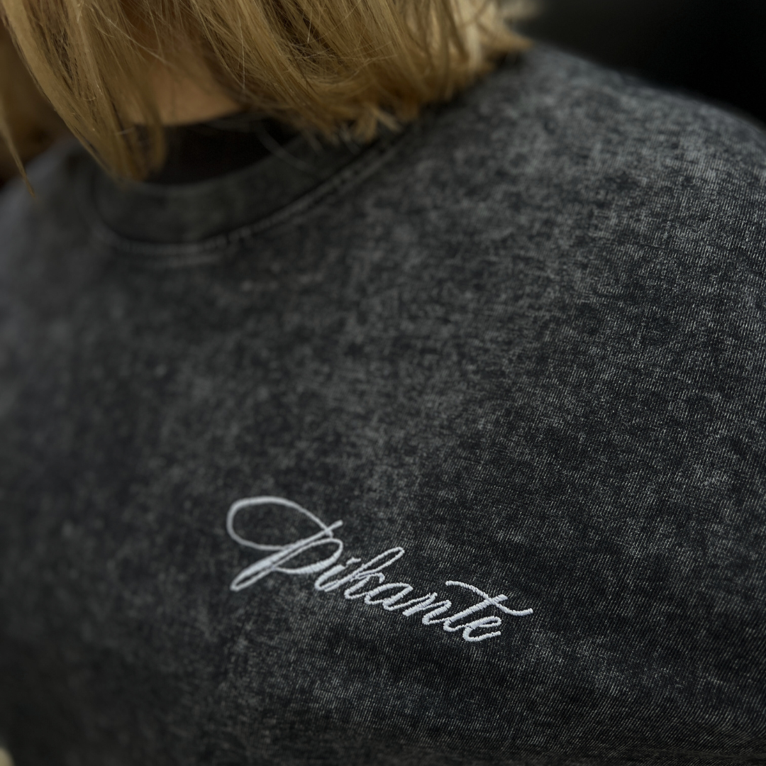 En el pecho, el detalle bordado de nuestro logo minimalista, en tono casi idéntico a la tela, con la nueva tipografía cursiva de Pikante. Sutil pero con presencia.